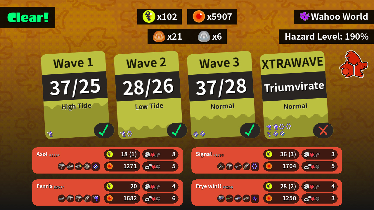 | Weapons | Grizzco Roller Ballpoint Splatling Splattershot Nova Grizzco Dualies | Undercover Brella Grizzco Roller Snipewriter 5H Grizzco Splatana | Clash Blaster Bamboozler 14 Mk I Splattershot Pro Grizzco Charger | Ballpoint Splatling Grizzco Roller Grizzco Roller Grizzco Splatana |