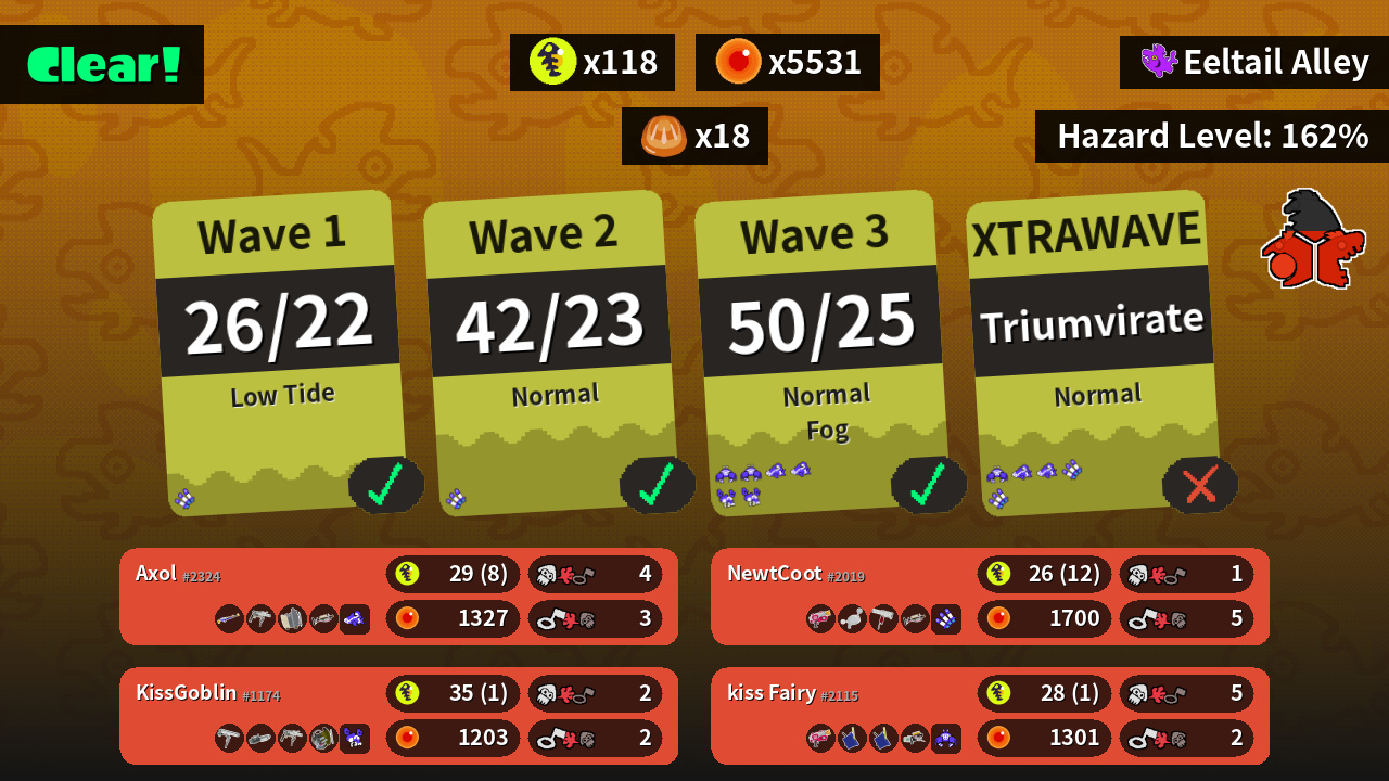 | Weapons | Splat Charger Grizzco Roller Sloshing Machine Grizzco Charger | Dynamo Roller Ballpoint Splatling Grizzco Roller Grizzco Slosher | Rapid Blaster Tri-Slosher Tri-Slosher Grizzco Blaster | Rapid Blaster Luna Blaster Flingza Roller Grizzco Charger |