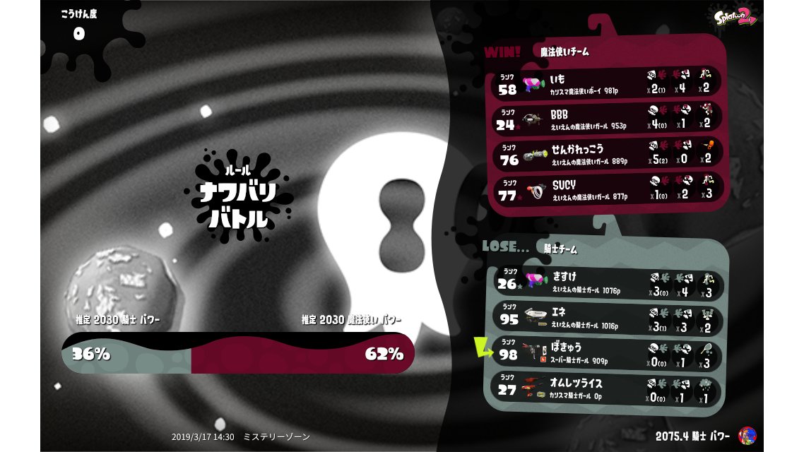 | Splatfest Title | 騎士 Defender 470 → 騎士 Defender 490 | |||||||||||||||||||||||||||||||||||||