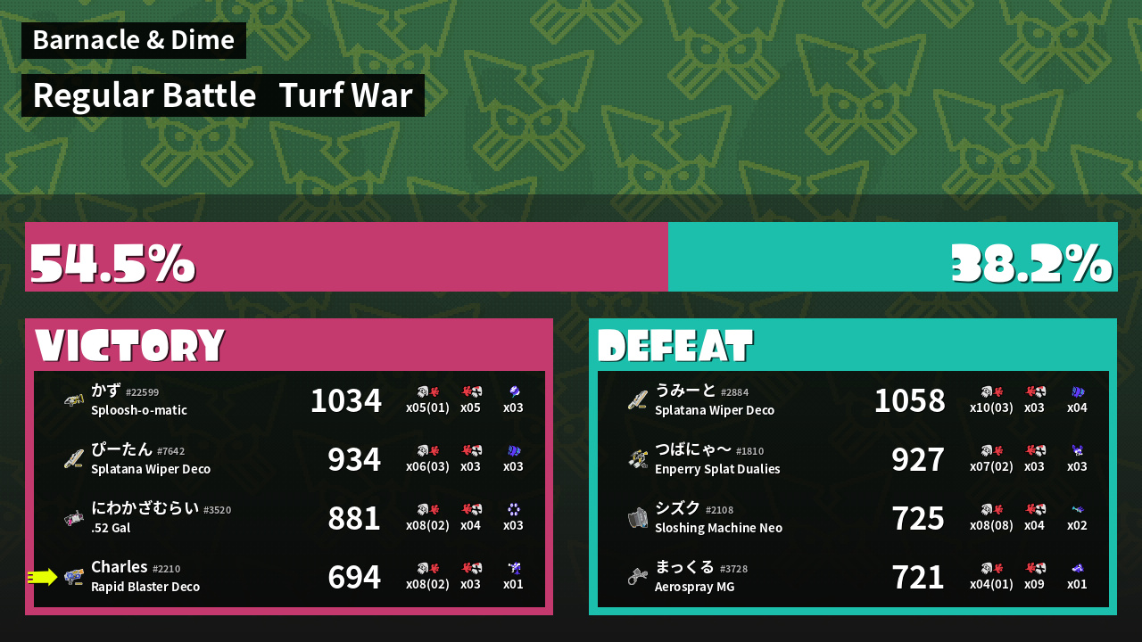 | Medals | #1 Overall Splatter #1 Enemy-Base Inker #1 Super Jump Spot | ||