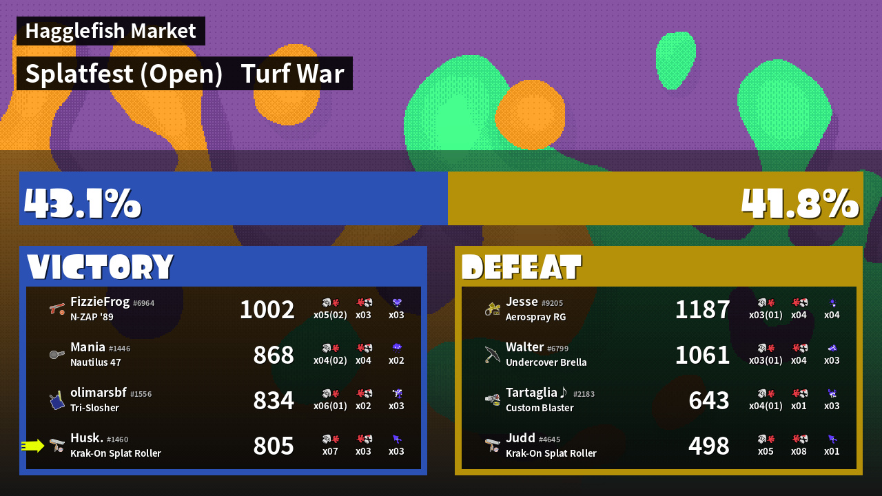 | Medals | #1 Overall Splatter #1 Home-Base Inker #1 Enemy Splatter | ||