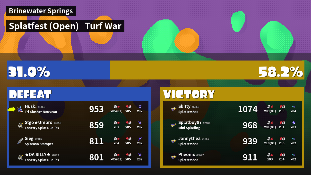 | Medals | #1 Overall Splatter #1 Turf Inker #1 Enemy-Base Inker | ||