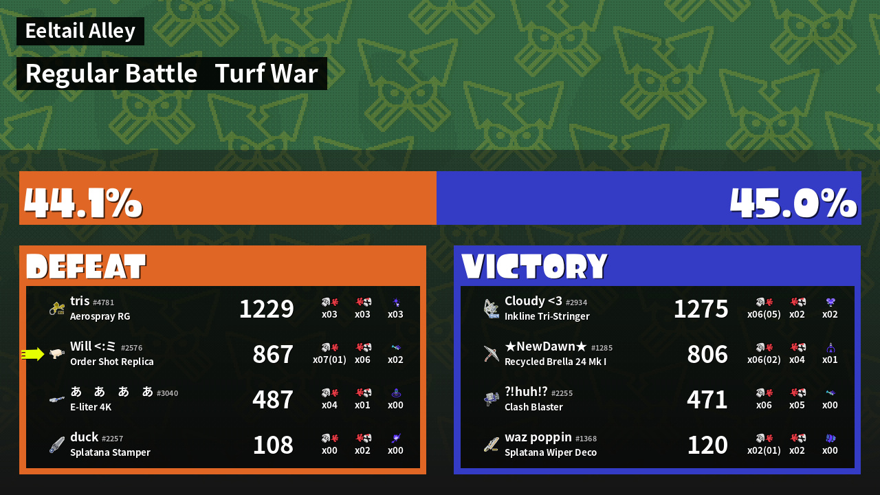 | Medals | #1 Overall Splatter #1 Enemy-Base Inker #1 Enemy Splatter | ||