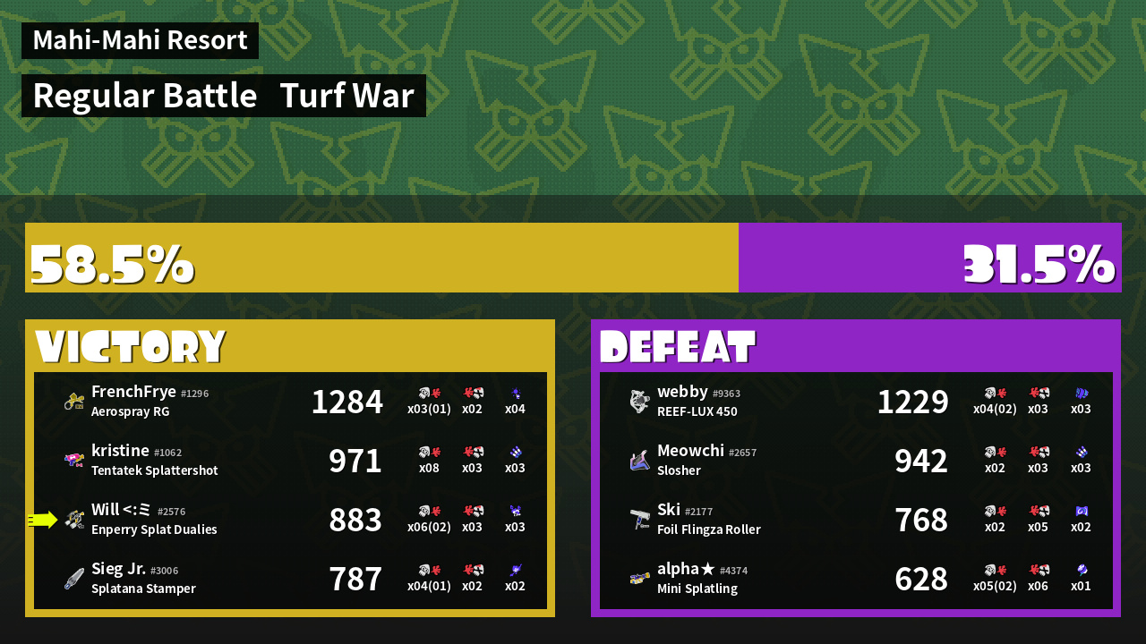 | Weapon | Enperry Splat Dualies ( Curling Bomb / Triple Splashdown) | ||