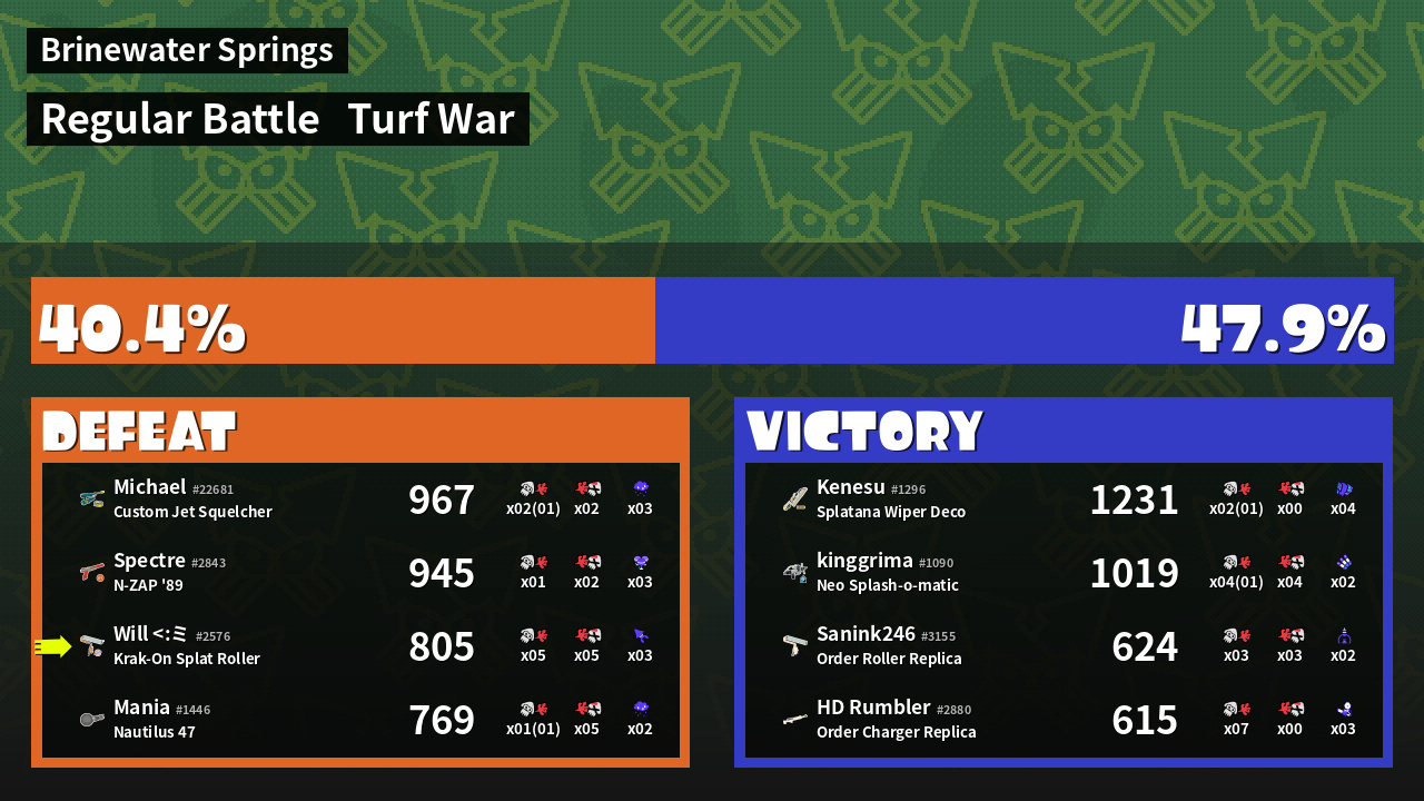 | Medals | #1 Overall Splatter #1 Popular Target #1 Enemy-Base Inker | ||