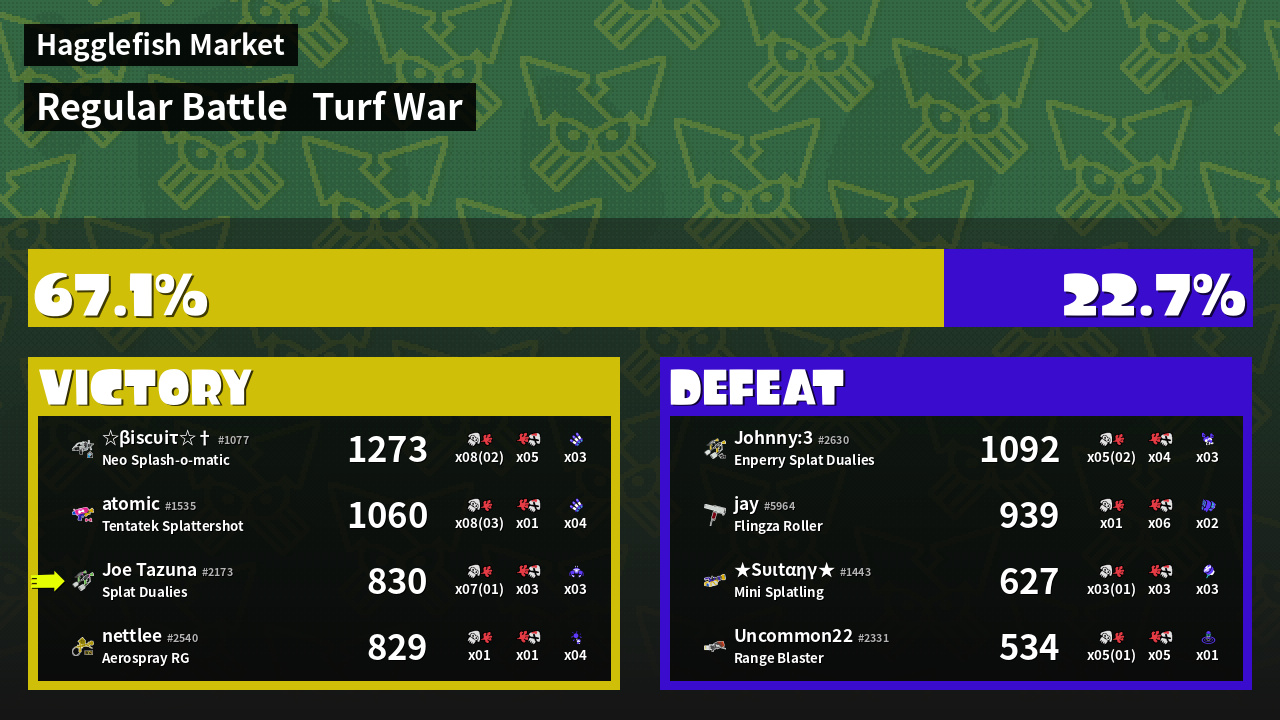 | Medals | #1 Enemy Splatter First Splat! #1 Crab Tank User | ||