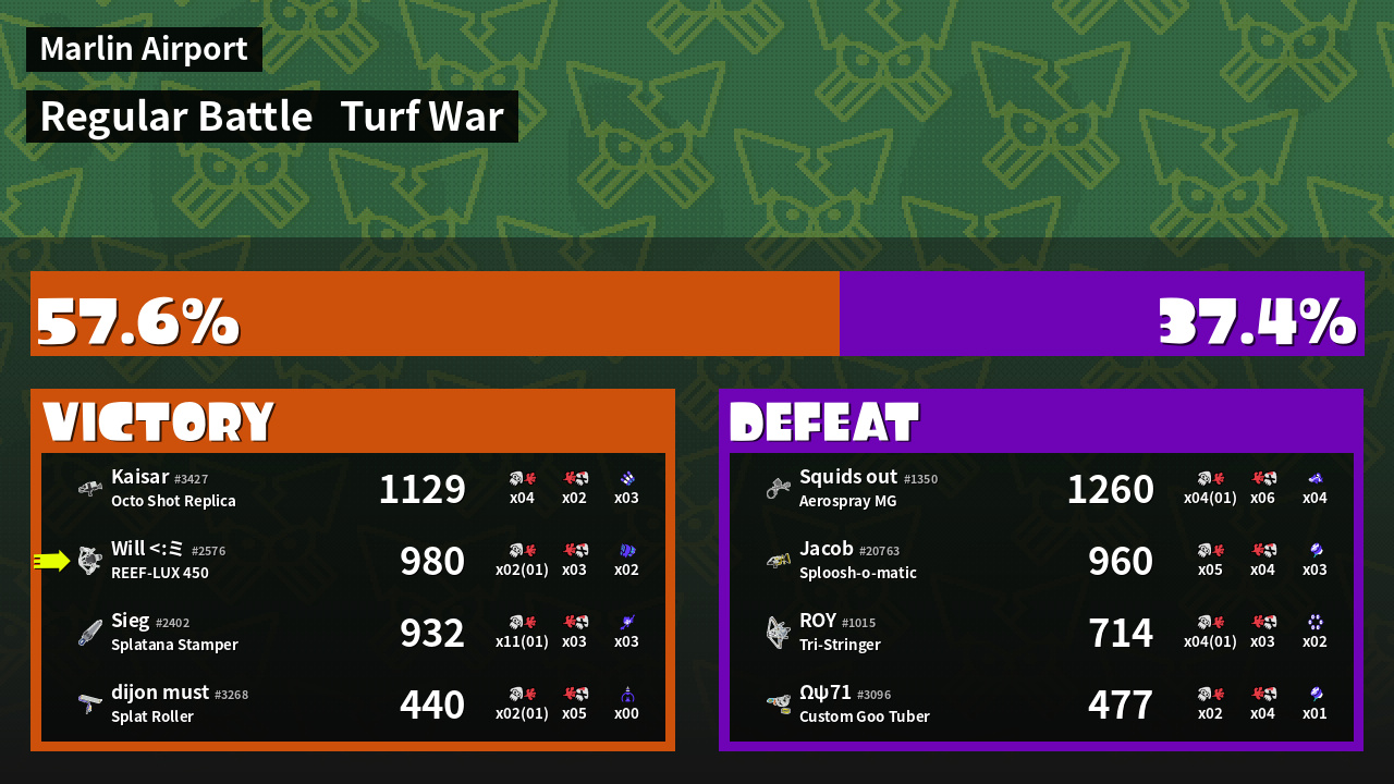 | Medals | #1 Home-Base Inker #1 Super Jump Spot #1 Splat Assister | ||