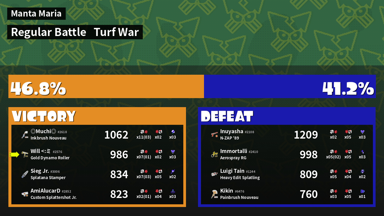 | Weapon | Gold Dynamo Roller ( Splat Bomb / Super Chump) | ||
