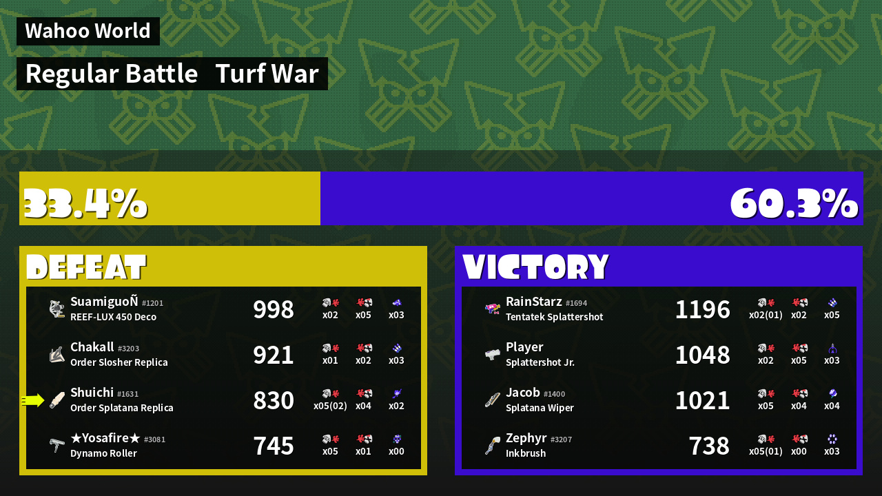 | Medals | #1 Overall Splatter #1 Enemy-Base Inker #1 Splat Assister | ||
