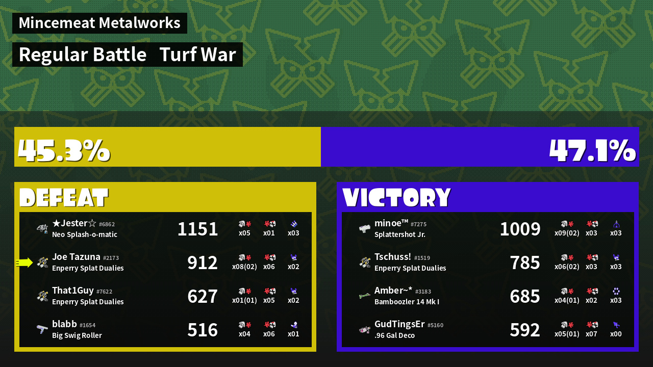 | Medals | #1 Overall Splatter #1 Enemy Splatter #1 Splat Assister | ||