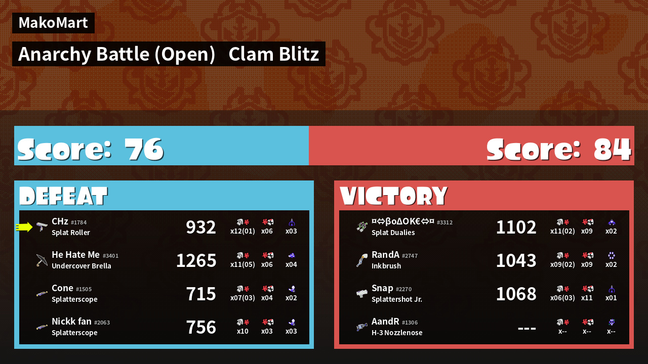 | Mode | Clam Blitz - Anarchy Battle (Open) | ||