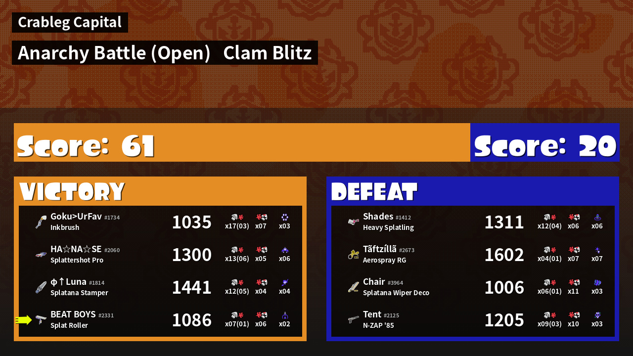 | Mode | Clam Blitz - Anarchy Battle (Open) | ||