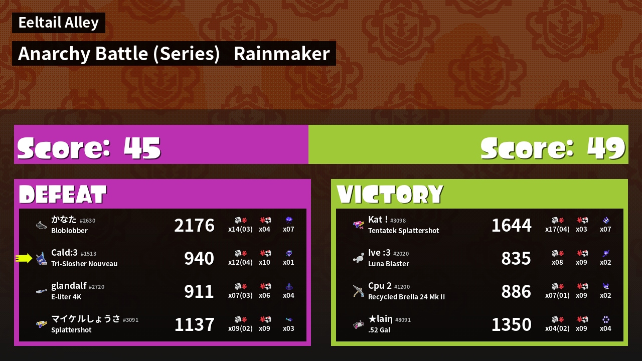 | Medals | #1 Score Booster #1 Splat Assister #1 Rainmaker Carrier | ||