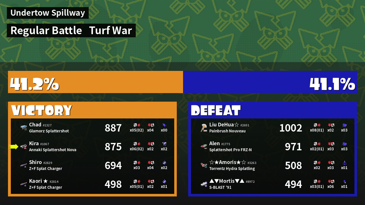 | Medals | #1 Overall Splatter #1 Enemy Splatter #1 Splat Assister |