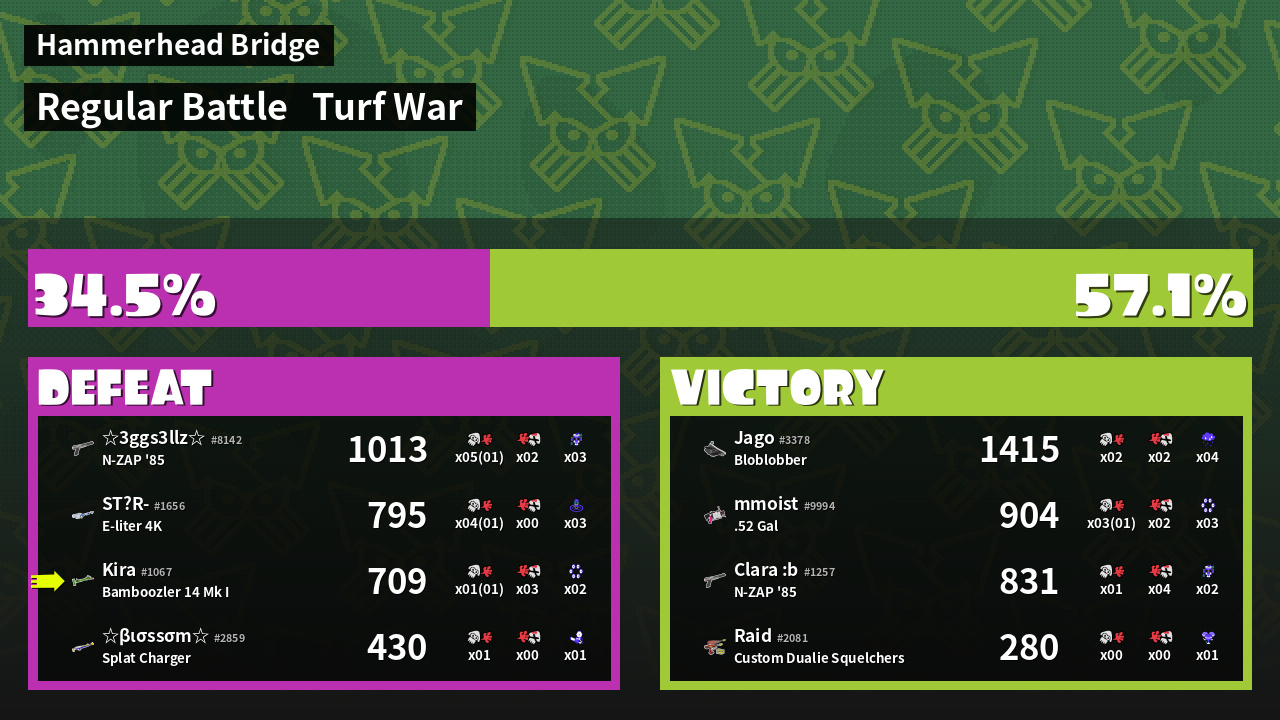 | Medals | #1 Enemy-Base Inker #1 Splat Assister #1 Base Defender | ||