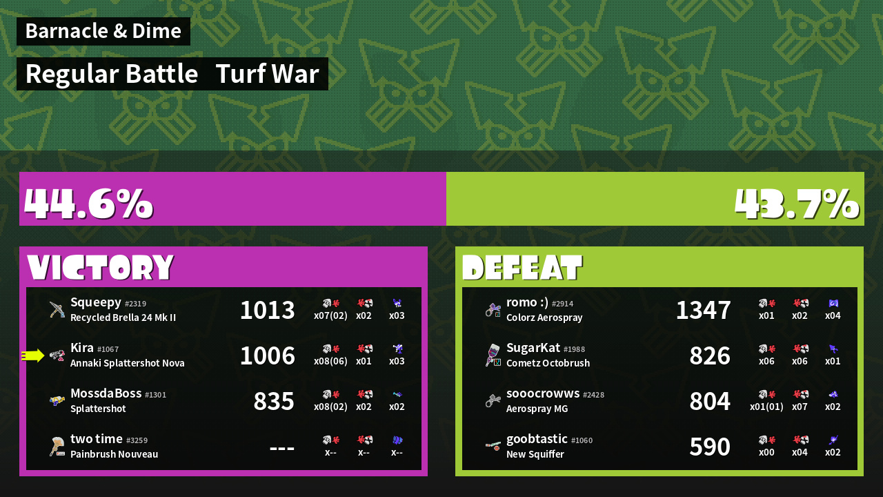 | Medals | #1 Overall Splatter #1 Enemy-Base Inker #1 Splat Assister |