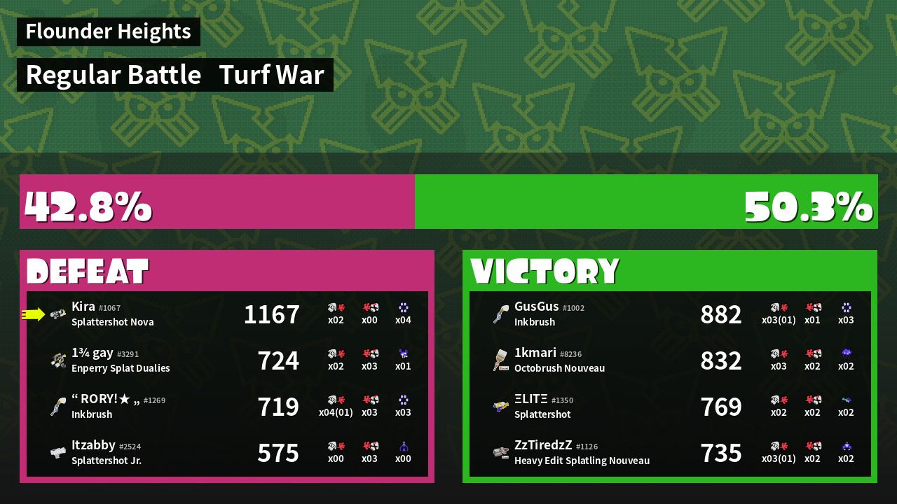 | Exhausted Jet Squelcher User  Kira #1067 |  Splattershot Nova                    | 1,167 | 2 + 0 | 0 | 99.99 |  4 | |