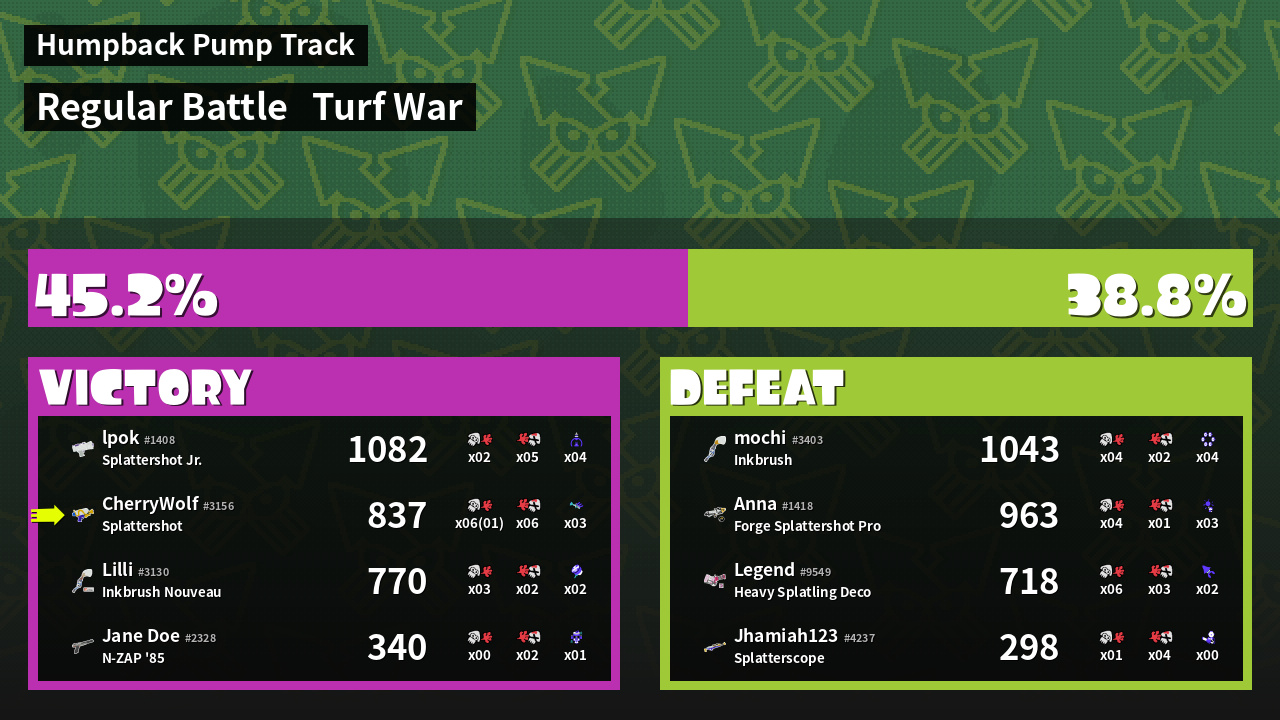 | Medals | #1 Overall Splatter #1 Enemy Splatter #1 Splat Assister | ||