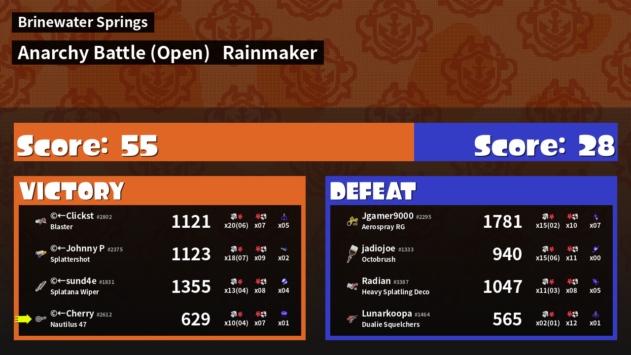 | Medals | #1 Rainmaker Stopper #1 Ink Storm User #2 Super Jump Spot | ||