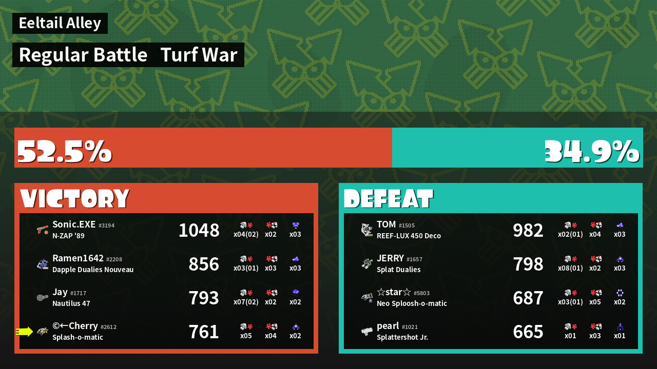 | Medals | #1 Enemy Splatter First Splat! #1 Crab Tank User | ||