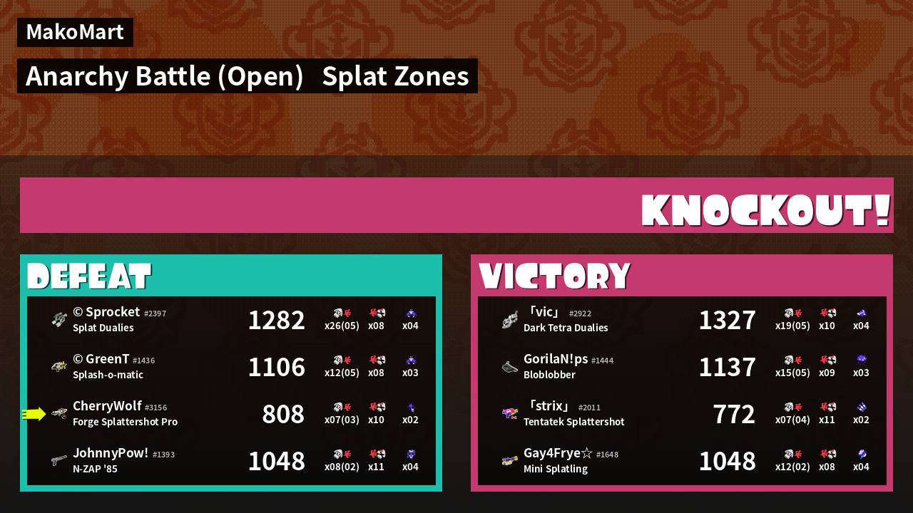 | Mode | Splat Zones - Anarchy Battle (Open) | ||