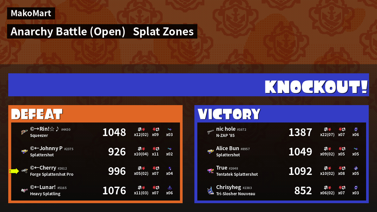 | Mode | Splat Zones - Anarchy Battle (Open) | ||