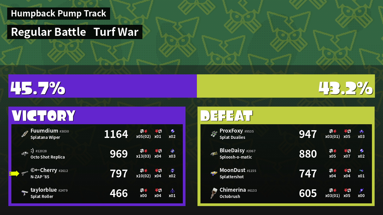 | Medals | #1 Base Defender #1 Ink Consumer #2 Overall Splatter | ||