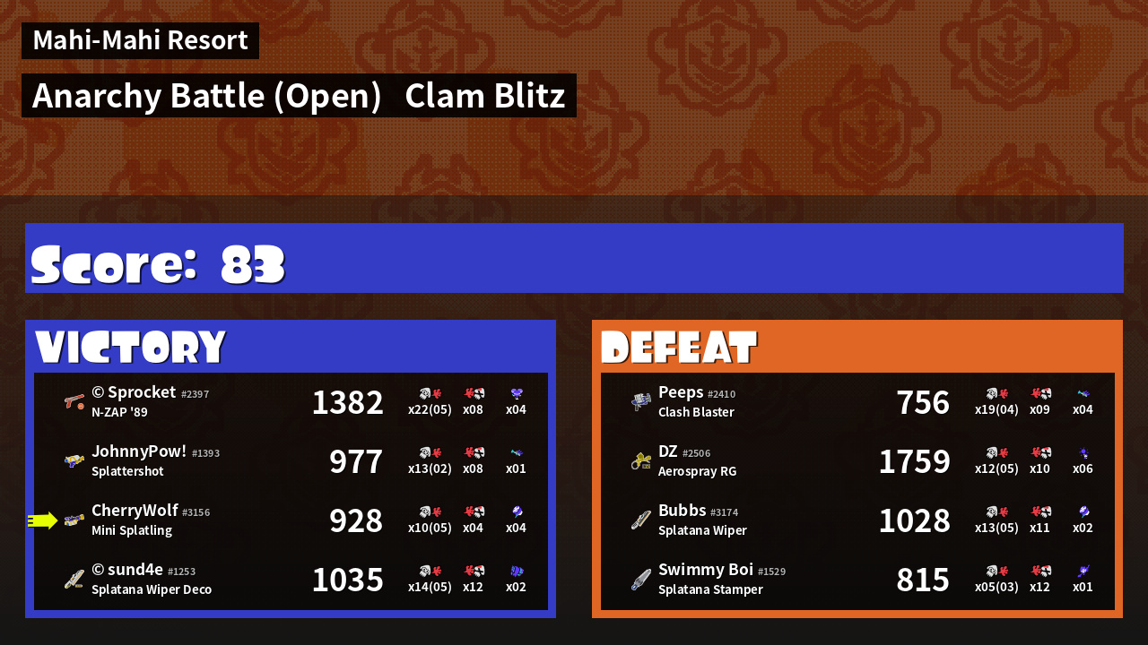| Medals | #1 Super Jump Spot #1 Splat Assister #1 Clam Stopper | ||