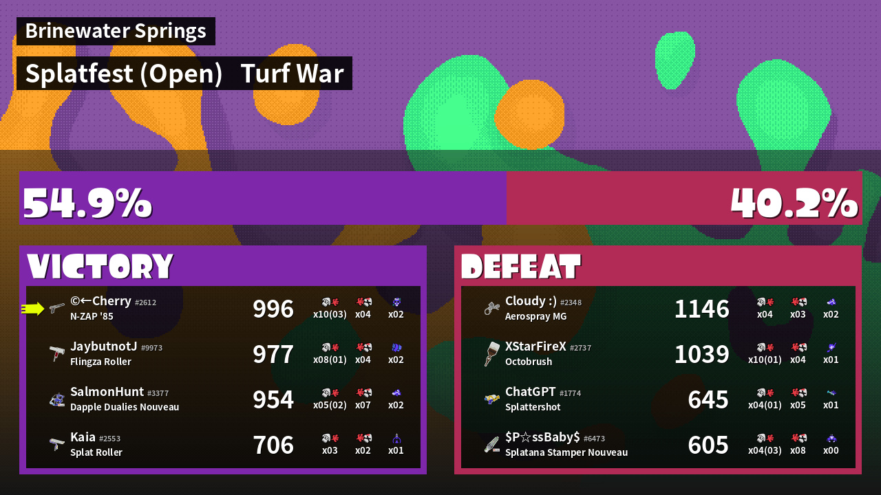 | Medals | #1 Overall Splatter #1 Turf Inker #1 Enemy Splatter | ||