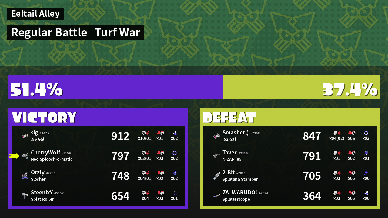 | Medals | #1 Splat Assister #1 Damage Taker #1 Killer Wail 5.1 User | ||