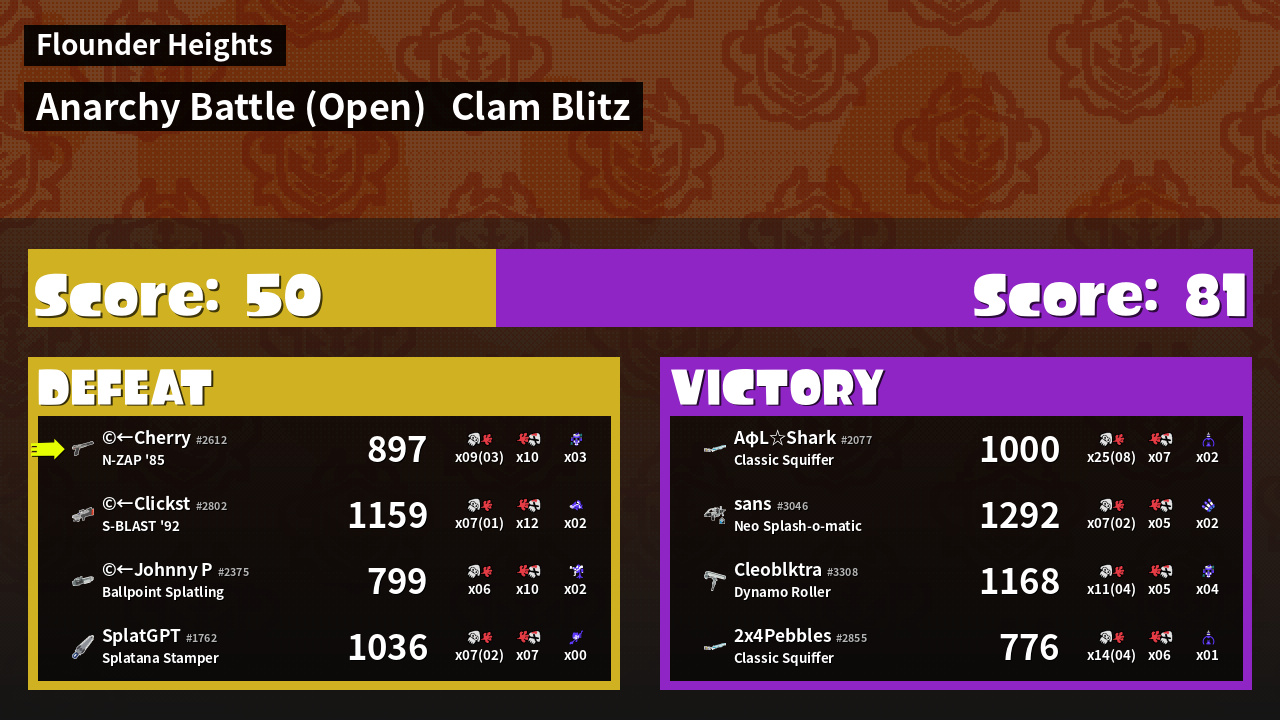 | Mode | Clam Blitz - Anarchy Battle (Open) | ||