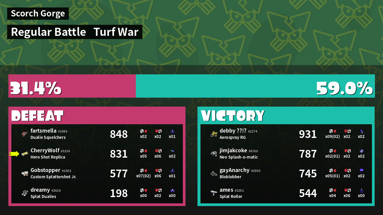 | Medals | #1 Enemy-Base Inker #1 Enemy Splatter #1 Ground Traveler | ||