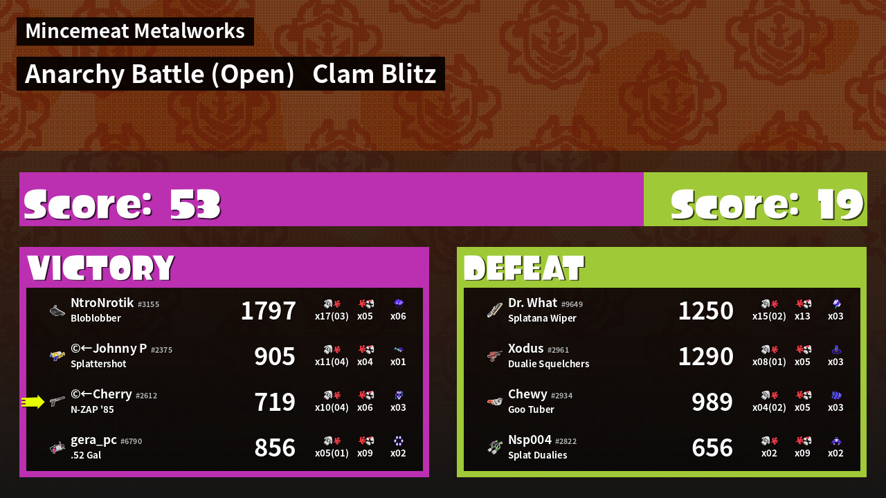 | Mode | Clam Blitz - Anarchy Battle (Open) | ||
