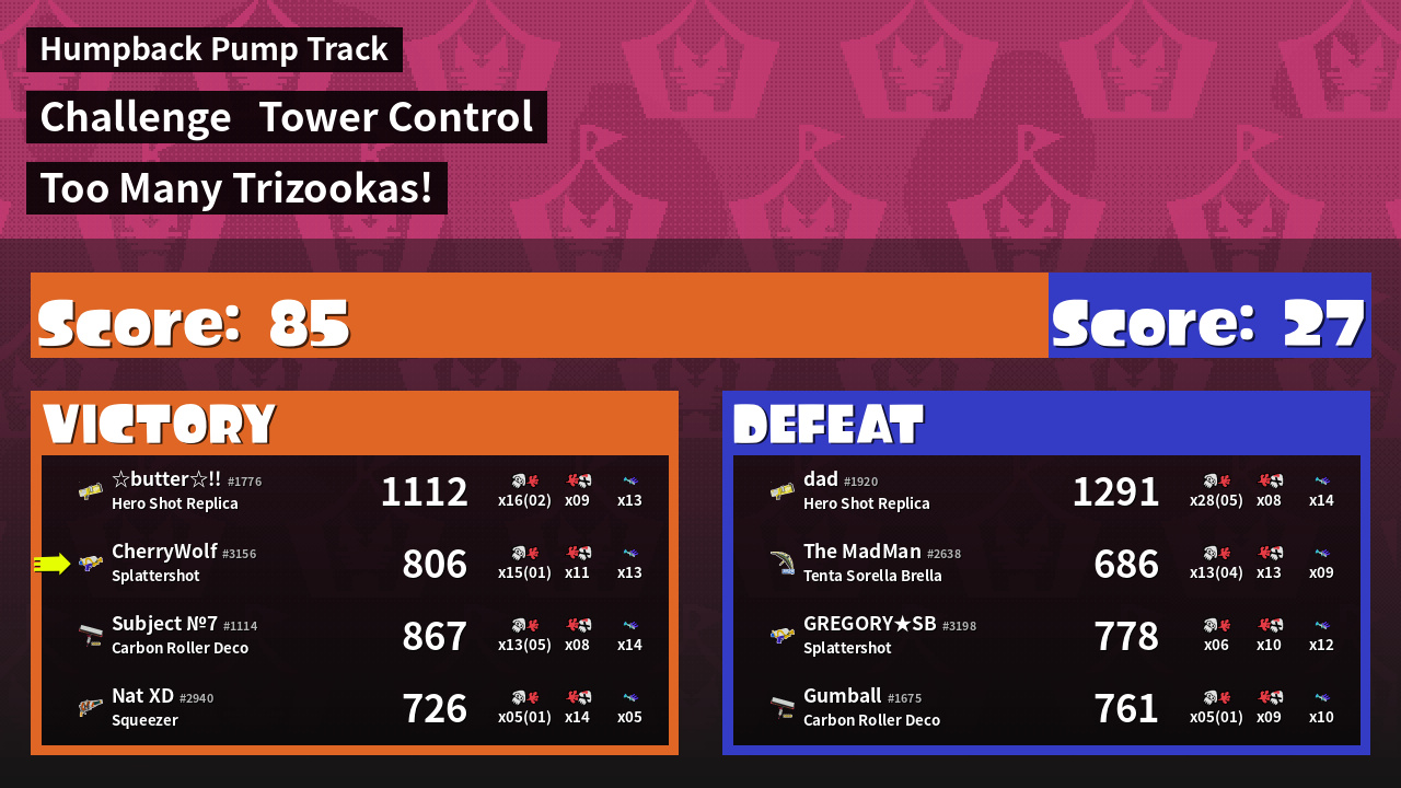 | Weapon | Splattershot ( Suction Bomb / Trizooka) | ||