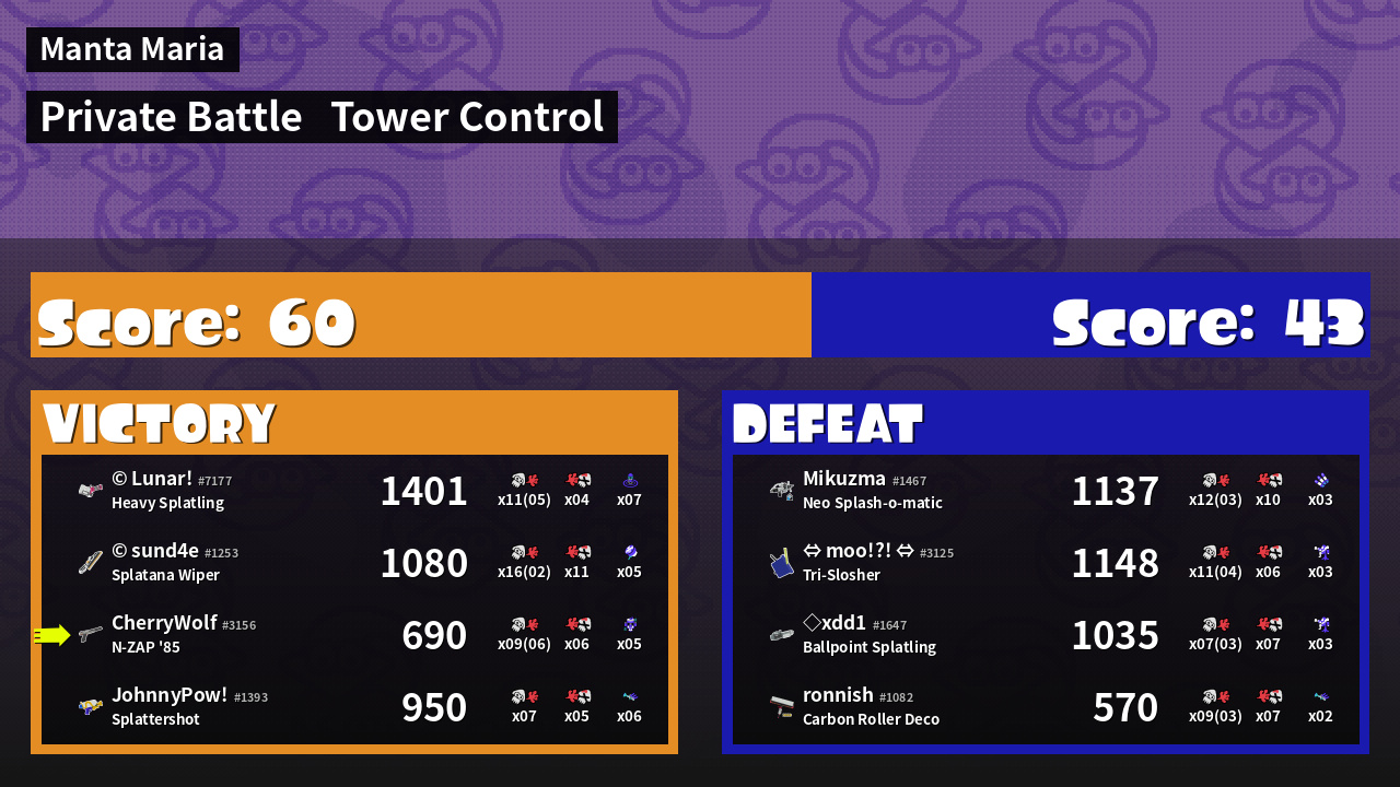 | Medals | #1 Super Jump Spot #1 Splat Assister #1 Tower Stopper | ||
