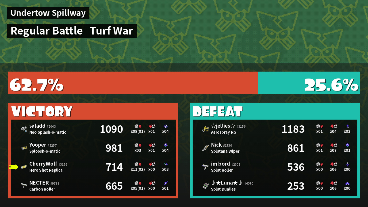 | Medals | #1 Overall Splatter #1 Enemy Splatter #1 Splat Assister | ||