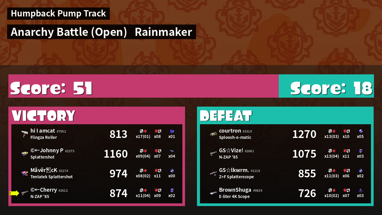 | Medals | #1 Splat Assister #1 Checkpoint Breaker #1 Rainmaker Stopper | ||