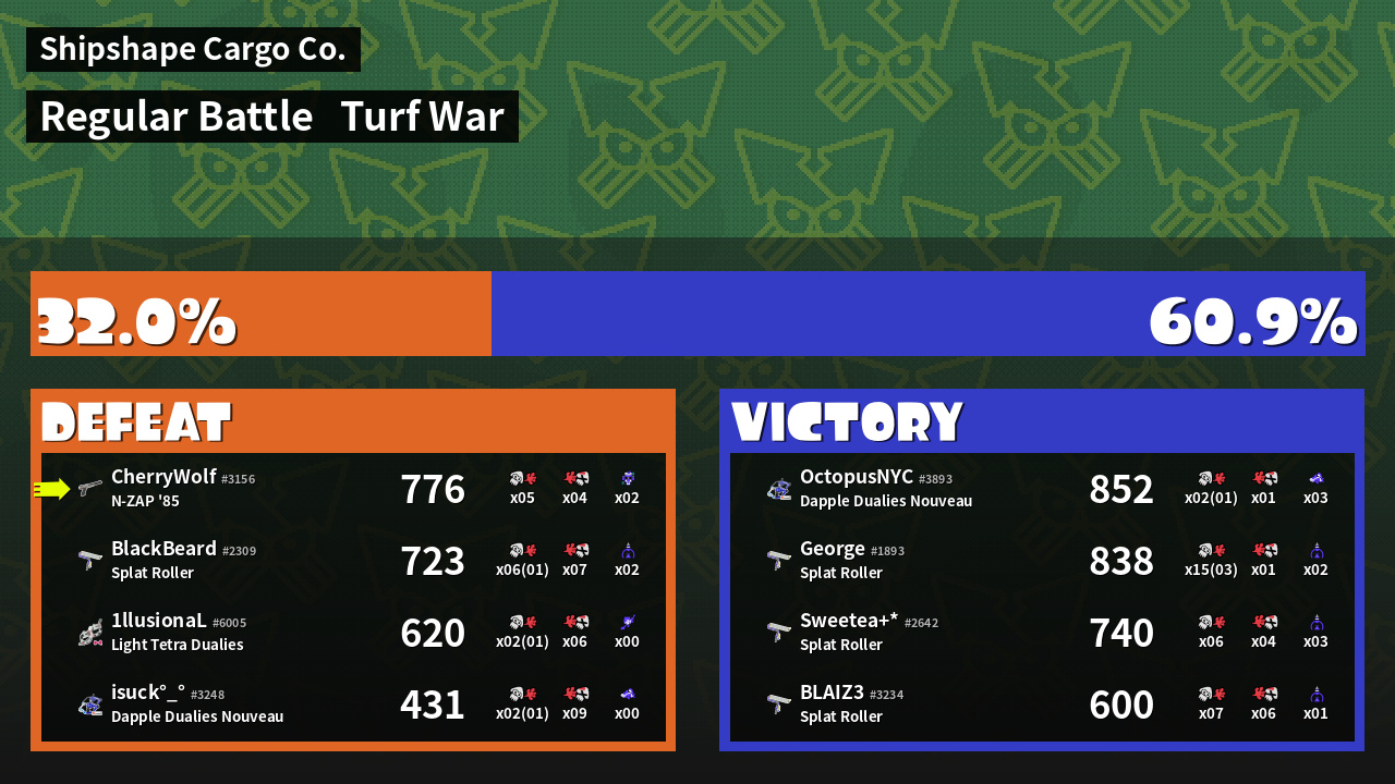 | Medals | #1 Turf Inker #1 Popular Target #1 Enemy Splatter | ||