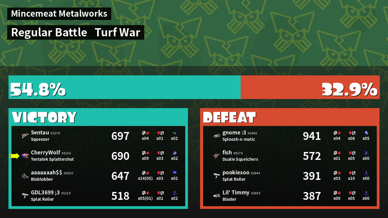| Medals | #1 Enemy Splatter #1 Triple Inkstrike User #2 Overall Splatter | ||