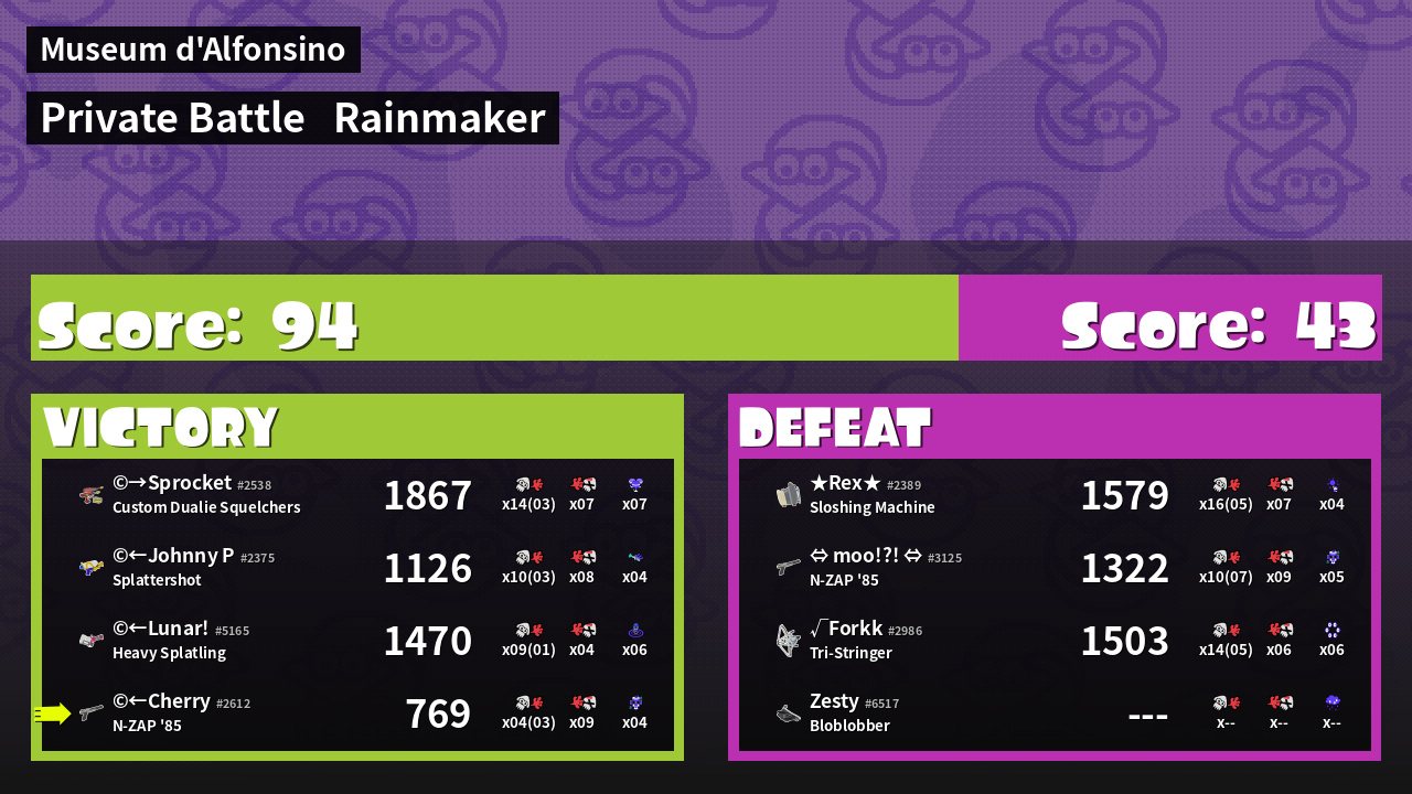 | Medals | #1 Splat Assister #1 Ground Traveler #1 Tacticooler User | ||