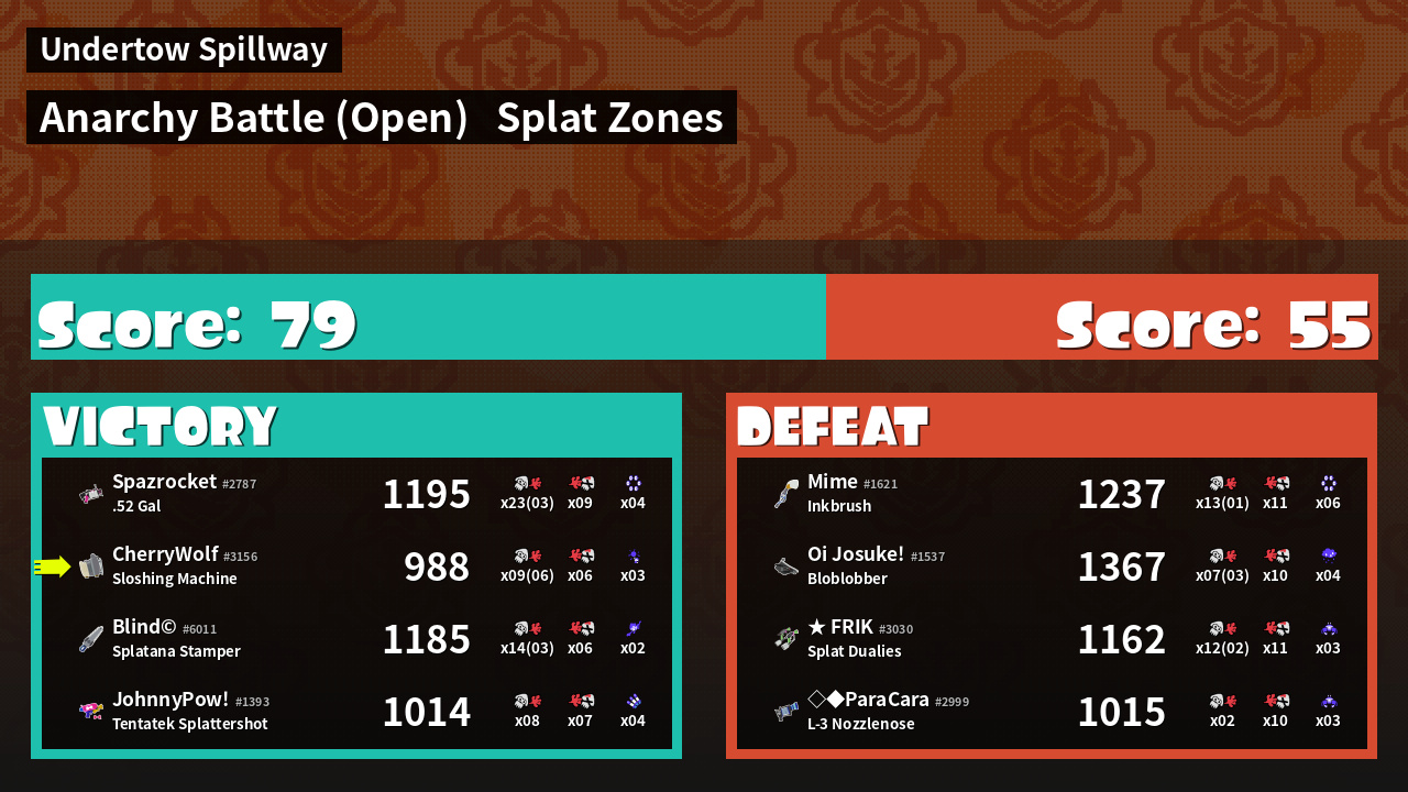 | Mode | Splat Zones - Anarchy Battle (Open) | ||