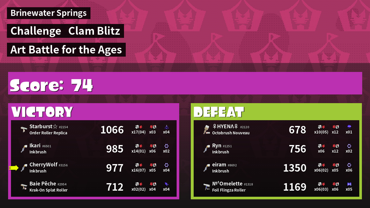 | Medals | #1 Splat Assister #1 Clam Stopper #2 Overall Splatter | ||