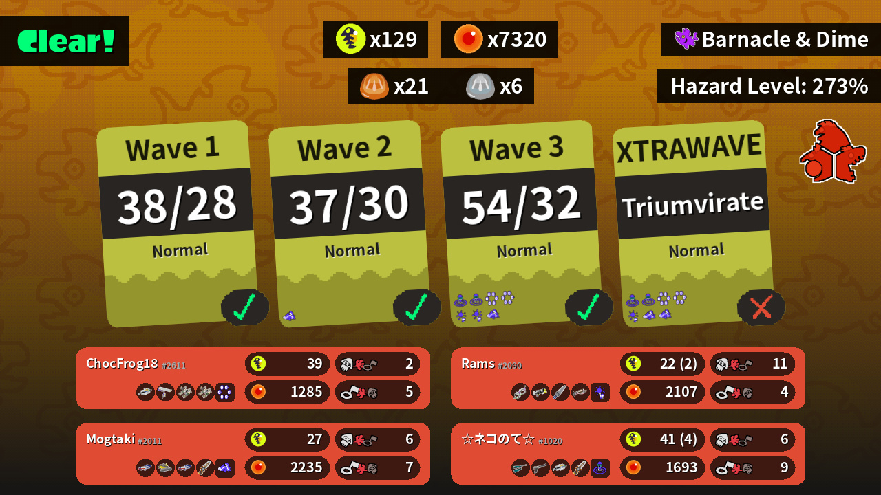 | Weapons | Grizzco Brella Splat Roller Grizzco Dualies Grizzco Dualies | Jet Squelcher N-ZAP '85 Grizzco Brella Grizzco Splatana | Splattershot Pro Dread Wringer Splattershot Pro Grizzco Splatana | Dark Tetra Dualies Splattershot Nova Splatana Stamper Grizzco Charger |
