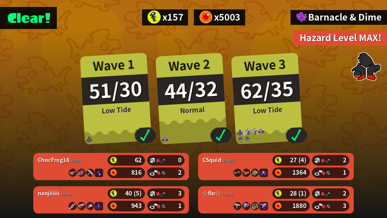 | Weapons | Rapid Blaster Pro Dapple Dualies Splat Brella | Splatana Wiper Rapid Blaster .52 Gal | Dynamo Roller Clash Blaster Grizzco Slosher | Bamboozler 14 Mk I Hydra Splatling Grizzco Dualies |