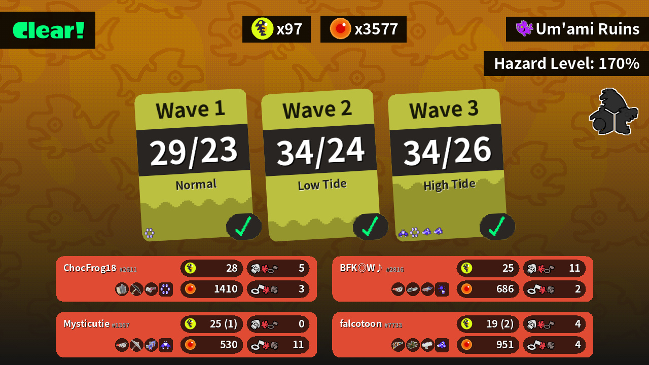 | Weapons | Sloshing Machine Undercover Brella Heavy Splatling | Goo Tuber Ballpoint Splatling Splattershot Pro | Goo Tuber Recycled Brella 24 Mk I Glooga Dualies | Squeezer Explosher Splattershot Jr. |