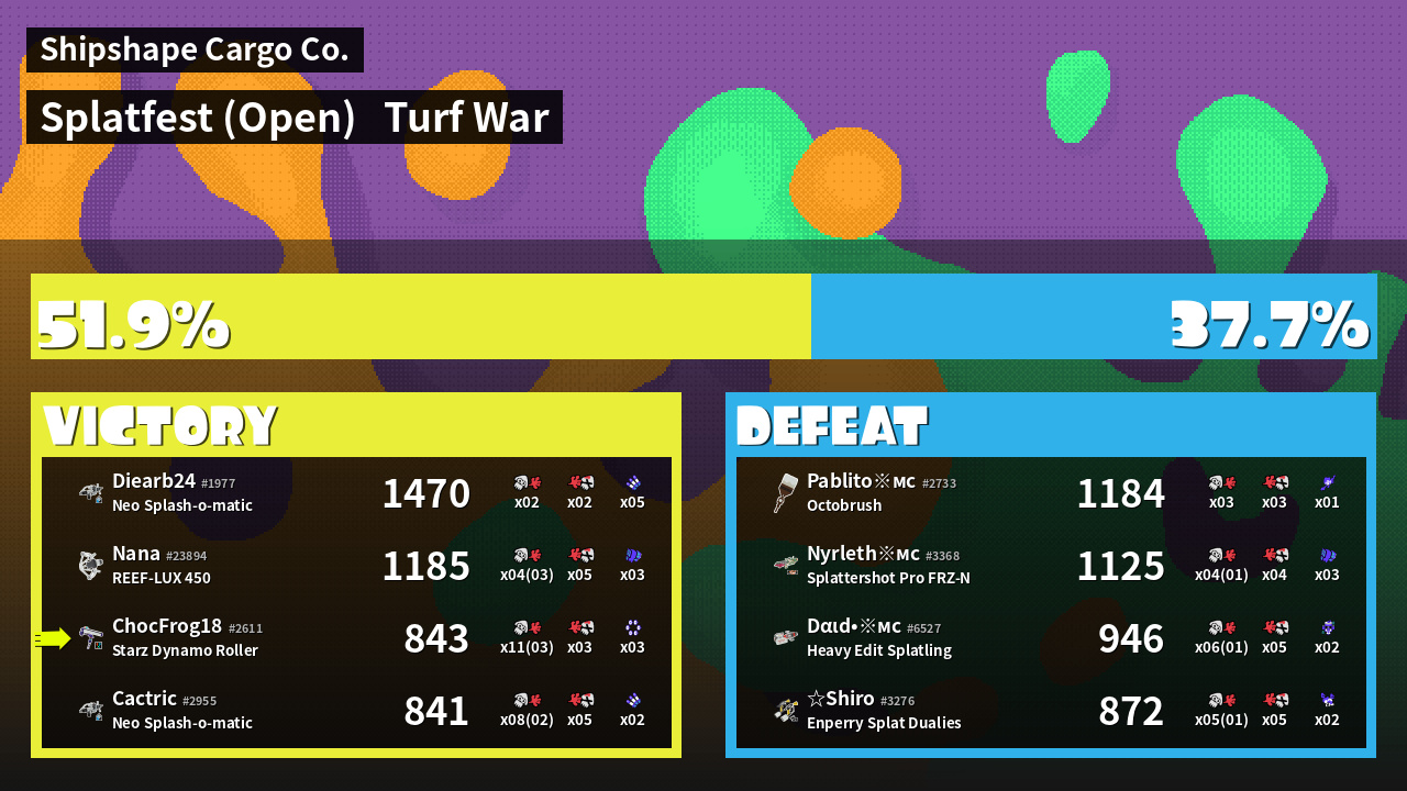 | Medals | #1 Overall Splatter #1 Enemy Splatter #1 Splat Assister | ||