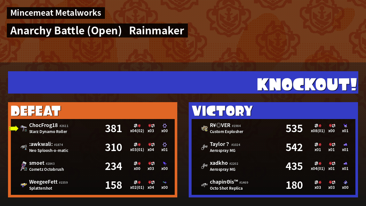 | Medals | #1 Overall Splatter #1 Turf Inker #1 Enemy Splatter | ||