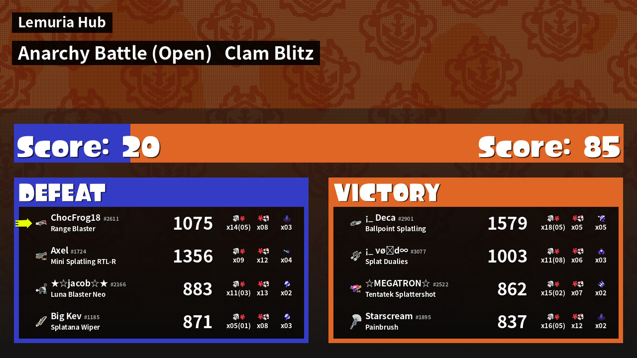 | Mode | Clam Blitz - Anarchy Battle (Open) | ||