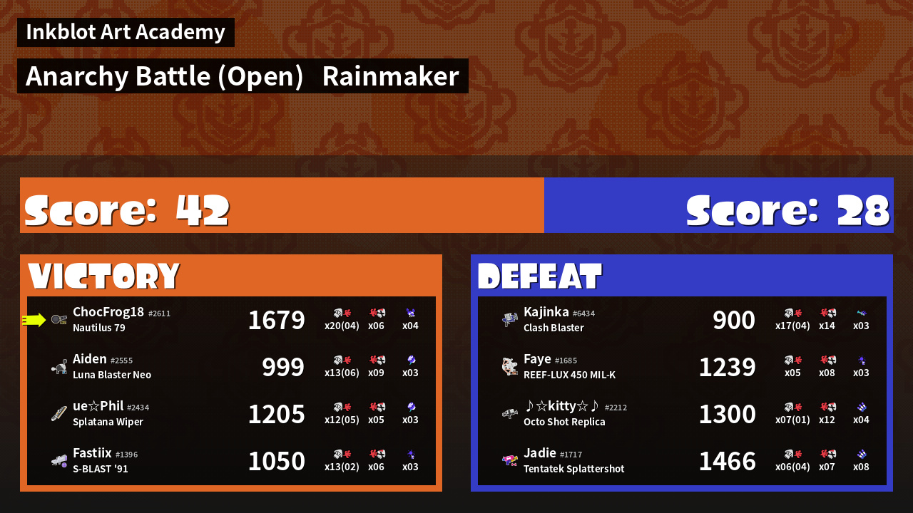 | Medals | #1 Overall Splatter #1 Score Booster #1 Turf Inker | ||