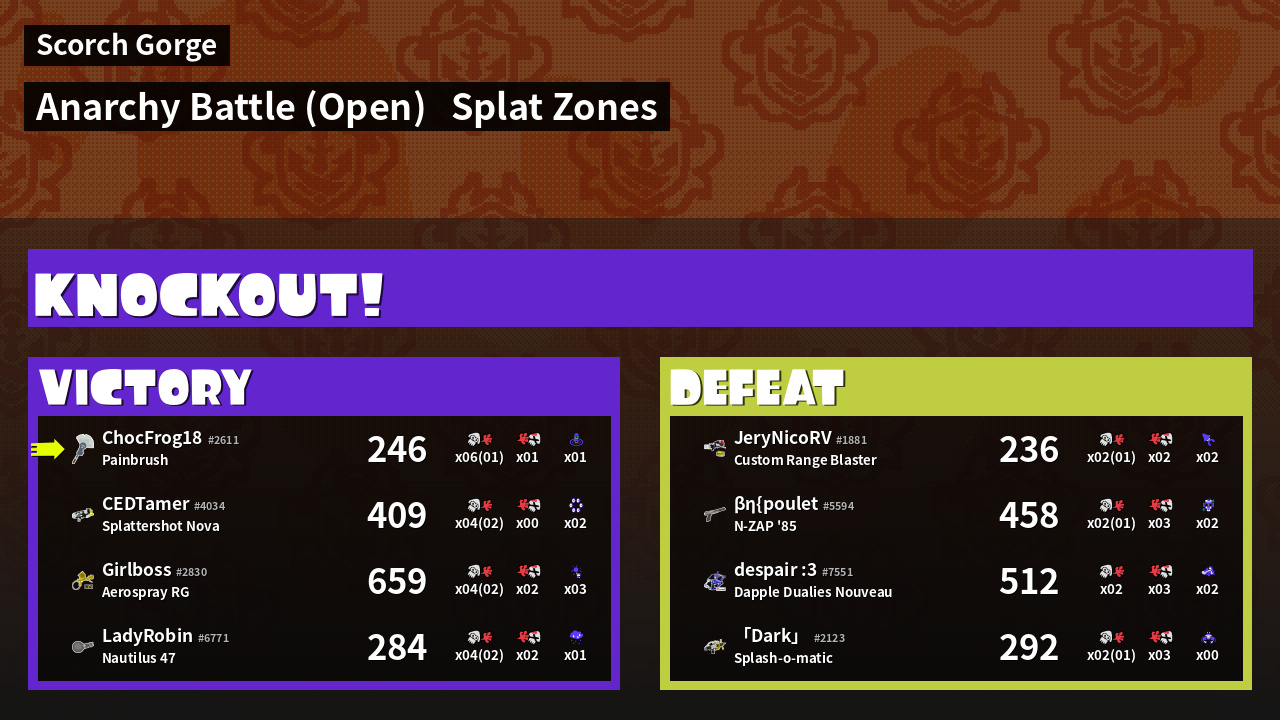| Mode | Splat Zones - Anarchy Battle (Open) | ||